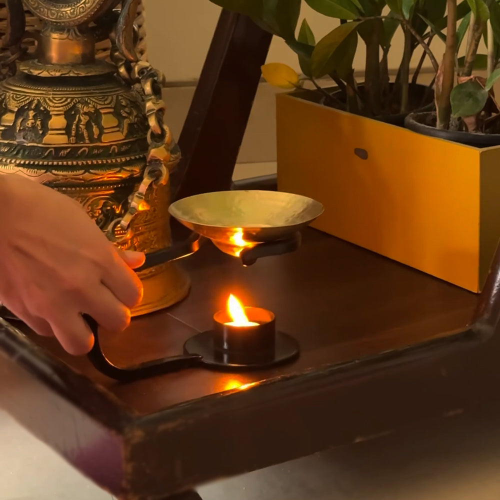 Handcrafted Aadya Brass Oil Diffuser & Burner with cast iron stand. Pour a few drops of essential oil into a water-filled hammered brass bowl, light a tea light below, and let soothing fragrance fill your space. Elegant, artisanal, and perfect for home or spa.