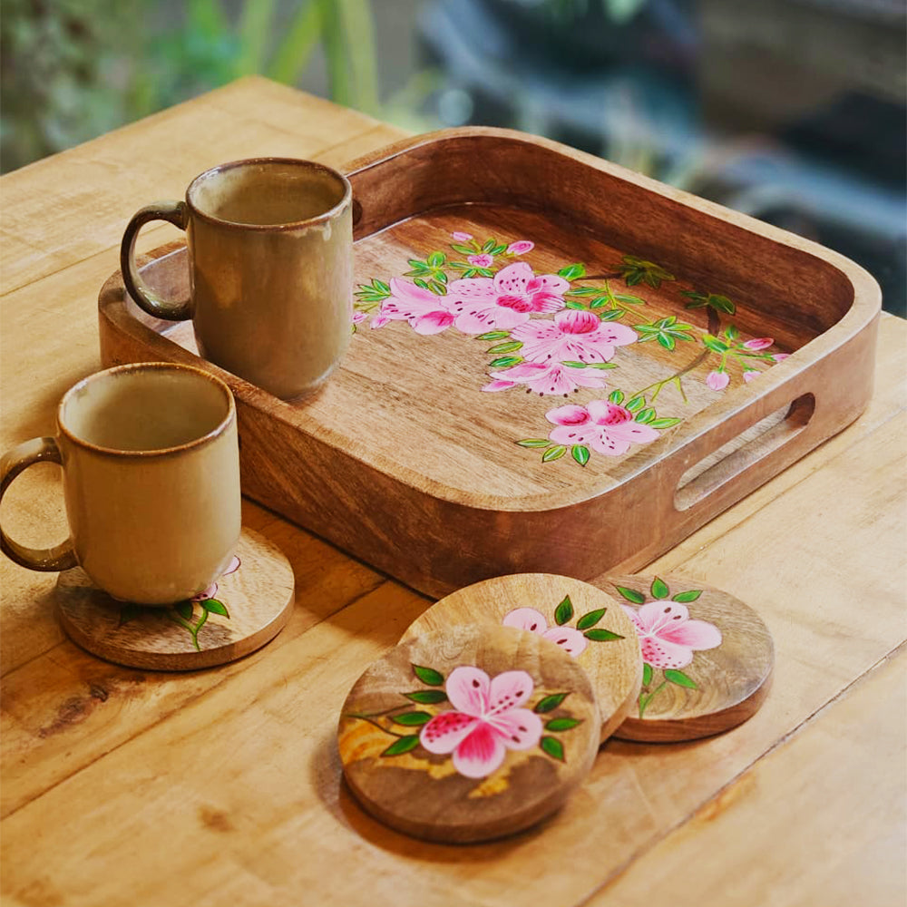 Yellow Marigold’s Handpainted Square Tray – Pink Azalea, crafted in premium mango wood. Perfect for daily use, festive occasions, or as a gift, this handcrafted tray is a statement piece that reflects the beauty of Indian craftsmanship.