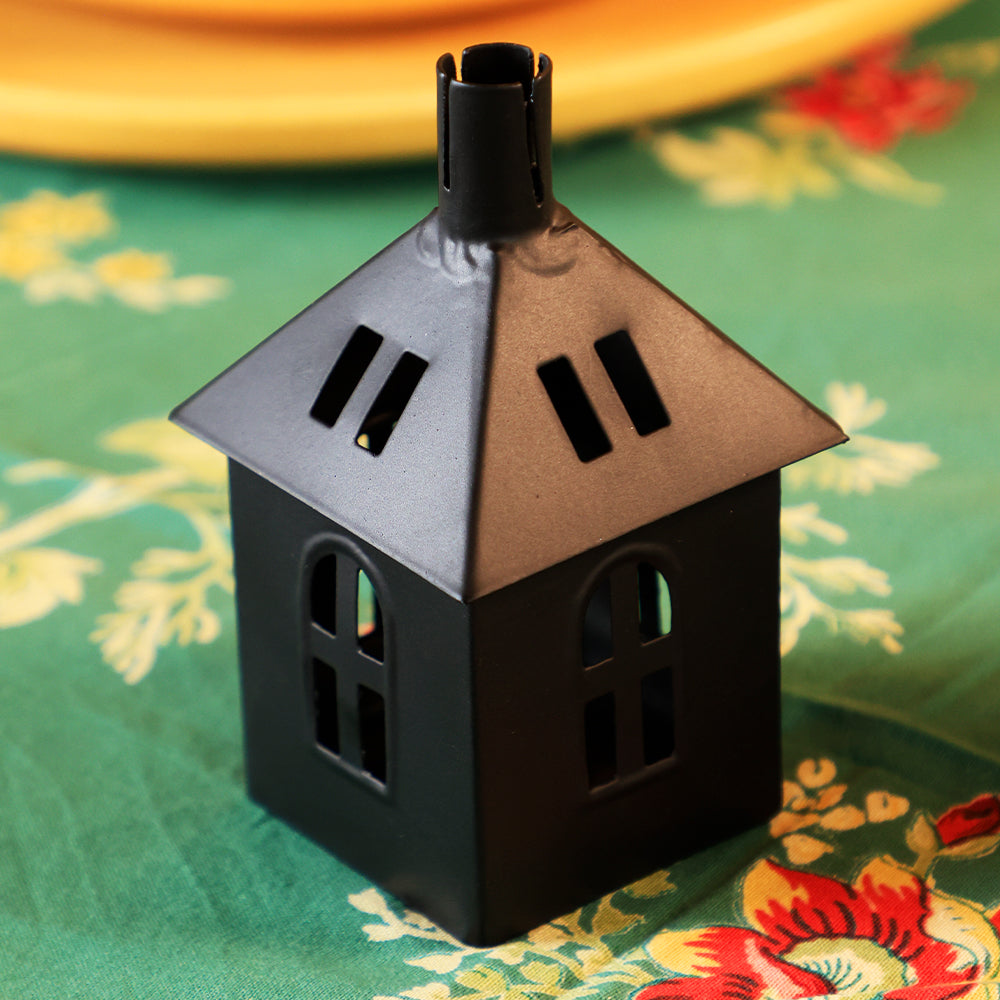 Its sculpted metal body, inspired by a quaint cottage form, features soft curves and window-like cutouts that create depth and shadow. The matte finish enhances its refined appeal, making it a versatile accent for contemporary and classic interiors alike.