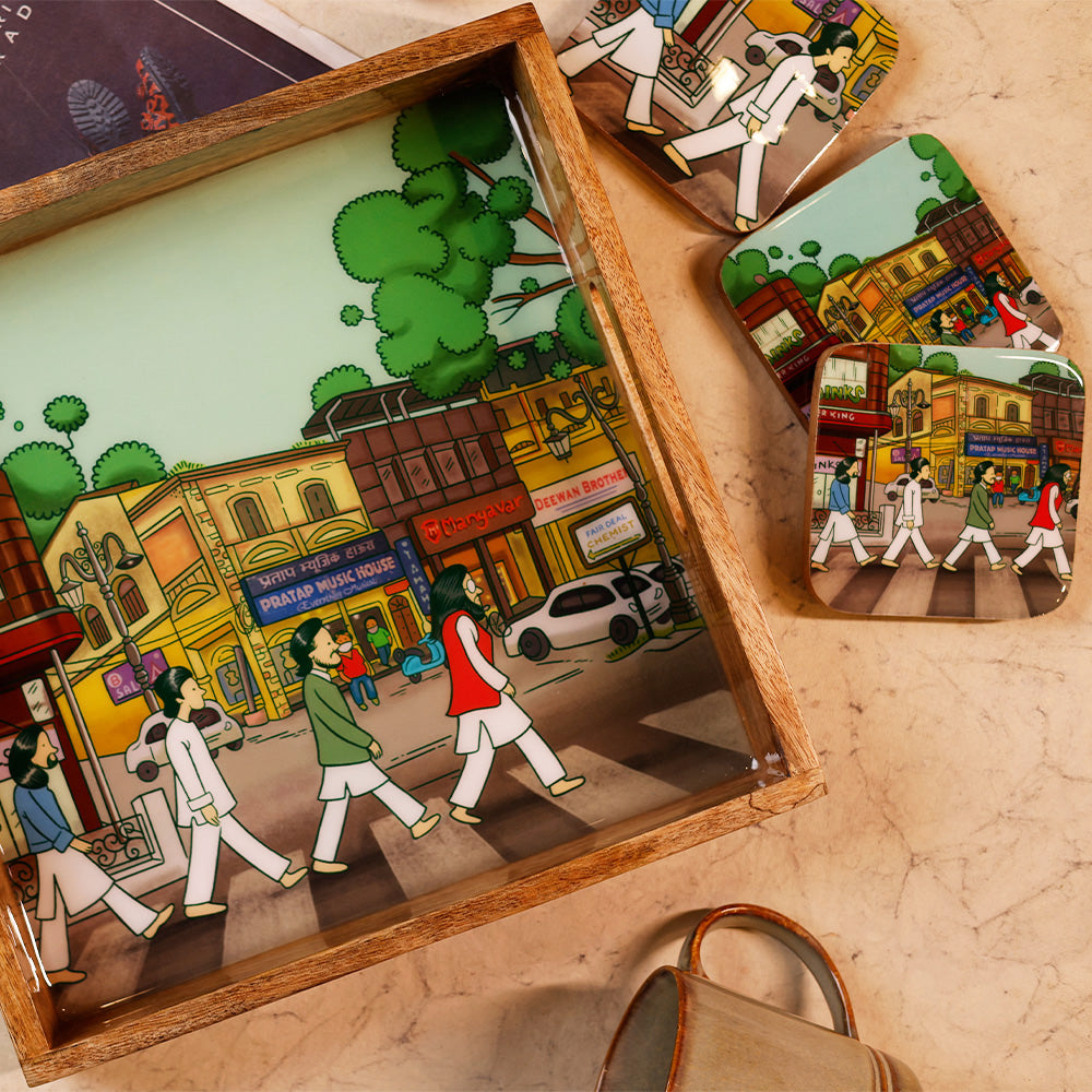 Ashley Hall: Wooden serveware features artwork by a local artist. This art captures the nostalgic feelings of Dehradun, a city of love located at the foothills of the Himalayas.